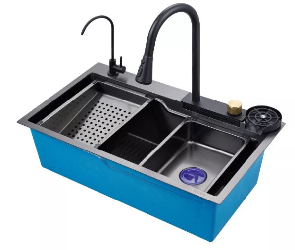 Мойка врезная OUTE многофункциональная прямоугольная T87846H 780x460x210, комплект: мойка нерж.сталь 304, 3мм, смеситель с выдв лейкой, кран для холодной воды, водопад, аппарат для мытья стаканов, 2 метал. корзины 250x360х100, доска разделочная, черн.[1]