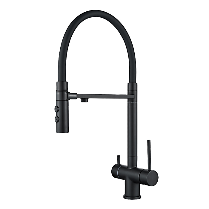 Этот двурычажный смеситель с высоким, гибким изливом и отдельным выходом под фильтр обеспечивает удобство использования и стильный внешний вид.